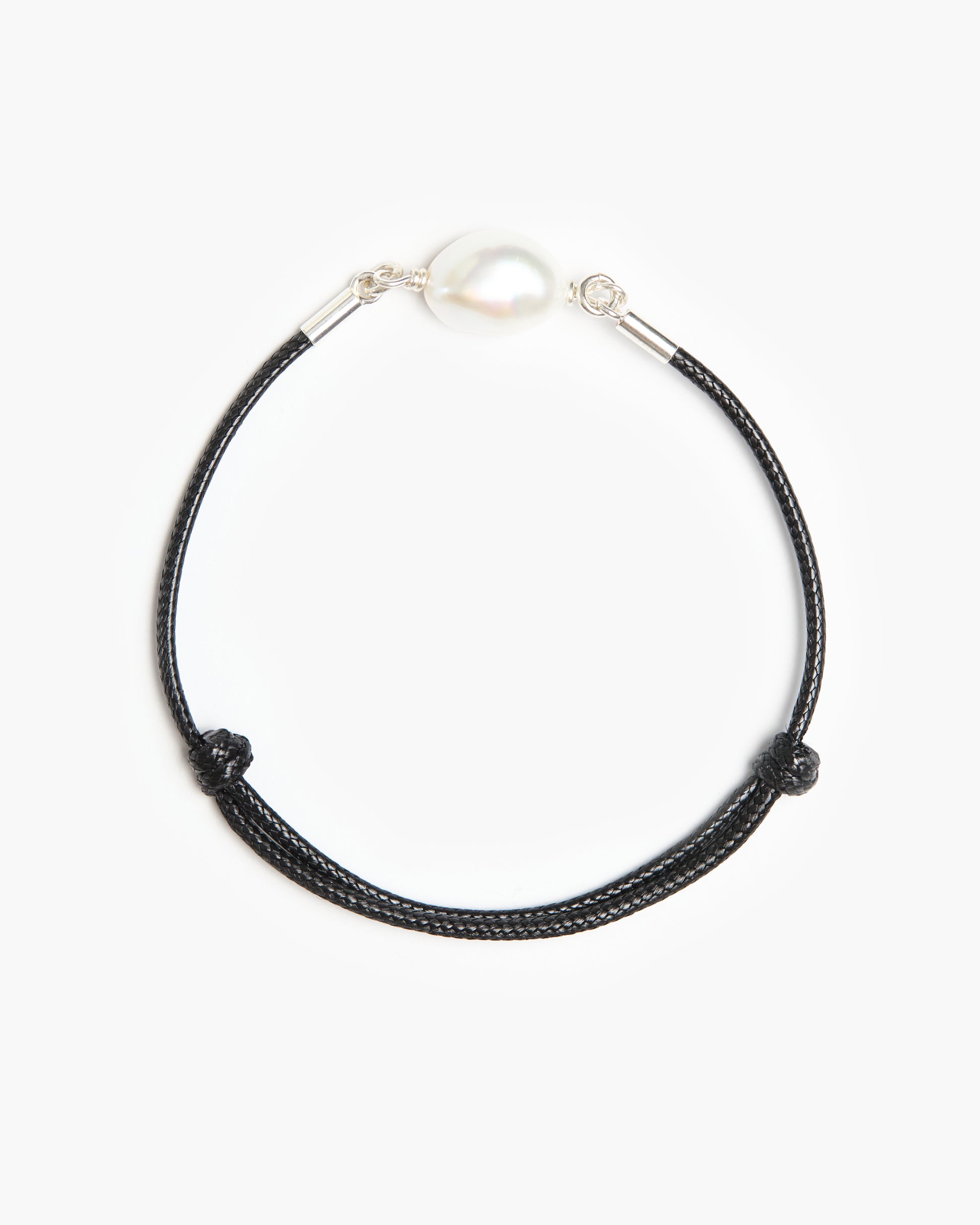 The Leather Eclipse Bracelet blends natural texture with minimalist design. Made from a black smooth leather sliding cord, it features a single freshwater pearl detail at the centre — a subtle focal point that contrasts soft lustre against rich, tactile leather.